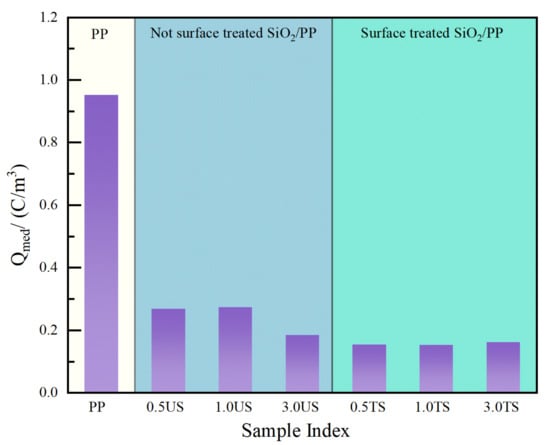 To further analyze the internal residual charge of the PP and SiO2/PP composites after 30 min short-circuit discharges, the average volume charge density was used to quantitatively analyze the amount of space charge accumulated in the different samples, and its calculation formula is [30]: