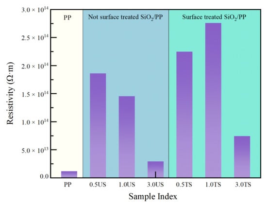 The volume resistivity of each specimen at a DC field of 4 × 107 V/m reveals that nanostructured SiO2 effectively enhances the volume resistivity of PP composites. In Figure 8, among the PP composites doped with SiO2 200, specimen 0.5 US exhibits the highest volume resistivity of 1.86 × 1014 Ω·m. However, the volume resistivity of specimen 3.0 US is less effective in enhancing the volume resistivity of PP due to the decrease in the specific surface area of nanostructured SiO2 caused by agglomeration.