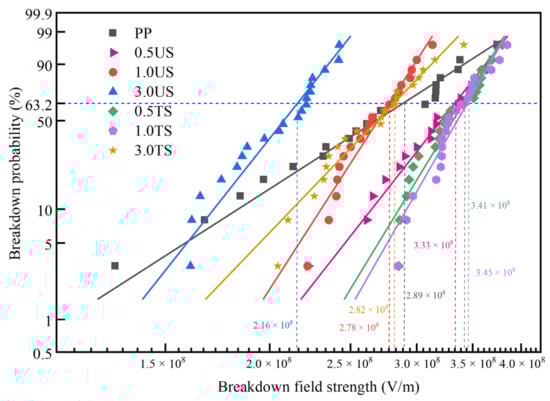 The DC breakdown performance test used the KZT-5 DC voltage breakdown testing machine produced by Yingkou Special Transformer Equipment Co., Ltd., Yingkou, China. The voltage was increased at a constant speed of l kV/s until the materials broke down. Two electrode systems were used in the DC breakdown experiment. The diameters of the upper and lower electrodes were 25 mm and 50 mm. To prevent surface discharge during the test, the sample and the whole electrode system needed to be wholly immersed in transformer oil. The electric breakdown strength field is generally analyzed by Weibull statistics of 2-parameter fitting measured data [29]. The formula is as follows: