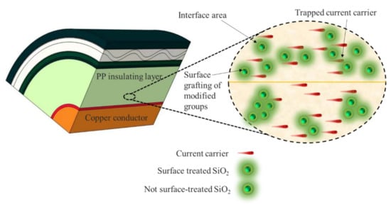 The lower space charge accumulation and average charge density after discharge in the composites incorporating SiO2 R974 compared to those incorporating SiO2 200 can be primarily attributed to the surface treatment of SiO2 with DDS. This treatment renders the siloxane chains and methyl groups formed by the reaction hydrophobic in nature. Consequently, the nanostructures are brought closer to the non-polar PP structure, facilitating better binding of the inorganic particles to the polymer matrix. As a result of the improved binding, the dispersion of nanomaterials within the matrix is enhanced, leading to tighter interfaces with the PP molecular chains. This, in turn, reduces defects in the PP structure, such as micron-sized cavities, and mitigates the damage caused to the PP molecular chains by high-energy electrons. The good dispersion of nanostructures provides more charge-trapping sites within the composite, and this is confirmed by the increased volume resistivity [19]. Ultimately, these factors contribute to an improvement in the DC breakdown field strength of the composite [38]. The schematic diagram of the SiO2 limiting carrier migration mechanism is shown in Figure 10.