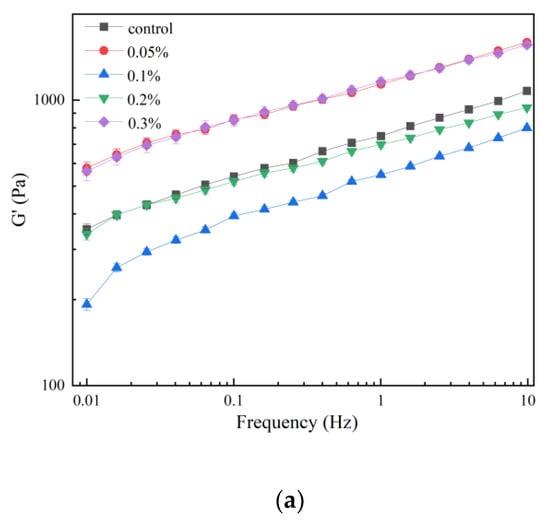 The particle size distribution of gel samples was analyzed using a laser diffraction particle size analyzer (SALD-2300, Shimadzu Corporation, Tokyo, Japan) according to the method reported previously []. The gel samples, stored at 4 °C for 48 h, were dispersed 10-fold with distilled water and stirred well before analysis. The refractive index of the particles was set at 1.45 with a precision of 0.001. The particle size polydispersity was characterized by the size distribution span using the equation: span = (D90 − D10)/D50, where D90, D10, and D50 are the volume diameters at 90%, 10%, and 50% of the cumulative size, respectively. Three replicates of each sample were tested.