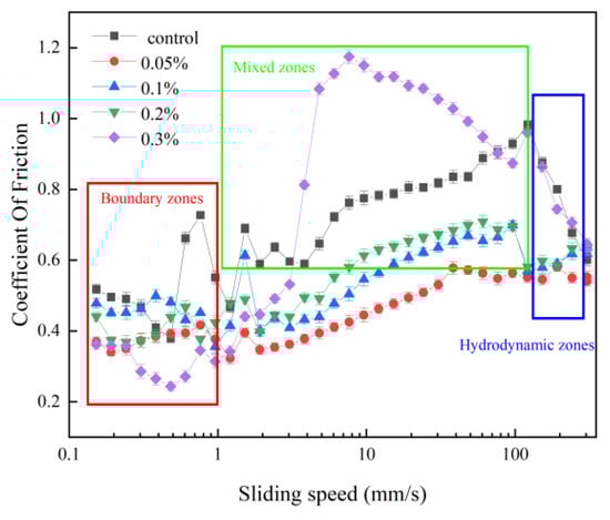 The viscoelastic properties of a gel can significantly impact its lubricating properties, which can be measured by analyzing the variation in friction using the Stribeck curve model. The curve is divided into three zones, namely the boundary zone, the mixed zone, and the hydrodynamic zone, each corresponding to a different fluid entrainment mechanism between the two contact surfaces []. Figure 2 shows the Stribeck curves of the five samples, with the boundary, mixed, and hydrodynamic zones clearly distinguishable.