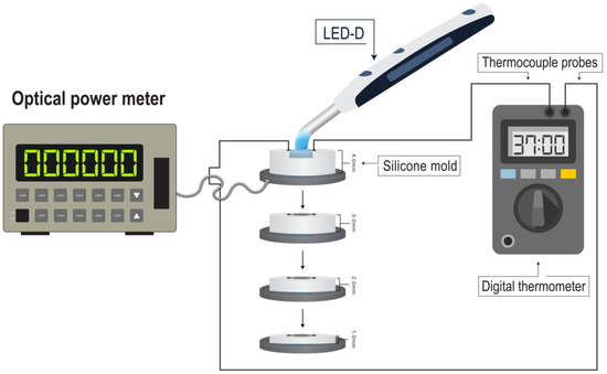 While the specimens were being cured, the temperature rise in 40 s was measured by two K-type thermocouples fitted to the indentations of the silicone molds and connected to a digital thermometer. To facilitate heat conduction from all areas of the specimens and maximum temperature recording during curing, the thermocouples were lightly coated with a thermal compound (ARCTIC MX-4, ARCTIC Gmbh, Brunswick, Germany). Furthermore, to assess the heating effect of the LCU alone, the temperature rise was measured using the same thermocouples inside the molds in the same manner but without specimens. A schematic representation of the whole apparatus is given in Figure 2.