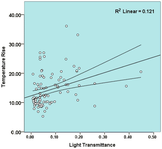 Relationship between light transmittance and temperature rise values. The middle lines show the line of best fit for the correlation and the two lateral lines show the 95% confidence intervals for the mean values.