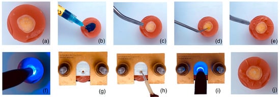 An etch and rinse protocol was used following the manufacturer’s recommendations. Phosphoric acid 37% (Total Etch, Ivoclar Vivadent, Liechtenstein—Batch number Z01KSS) was used for 15 s and then rinsed with water for 15 s. The teeth were dried with oil-free air for 5 s. A microbrush was used to scrub the dentin with a universal bonding agent, Prime and Bond Active® (Dentsply Sirona, Konstanz, Germany—Batch number 2102000523), for 20 s, and the solvent was left to evaporate for 5 s. Finally, each specimen was polymerized for 20 s using a light-emitting diode (LED) unit (Demi™, SDS Kerr Corp, Orange, CA, USA.) with an intensity of 1200 mW/cm2.