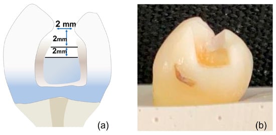 The cavity design was class II restorations with 2 × 2 × 2 mm +/− 0.5 measurements prepared using a carbide bur #245 (Komet Dental, Lemgo, Germany) and measured with a periodontal probe to maintain standardization of the cavities (Figure 2).