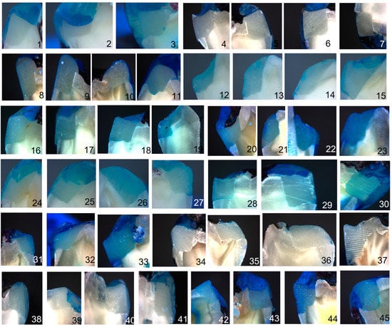 - Cayo-Rojas, C.F.; hernández-Cana, K.K.; Aliaga-Mariñas, A.S.; Ladera-Castañeda, M.I.; Cervantes-Garroza, L.A. Microleakage in class II restorations of two bulk fill resin composites and a conventional nanohybrid resin composite: An in vitro study at 10,000 thermocycles. BMC Oral Health 2021, 21, 619. [Google Scholar] [CrossRef] [PubMed]