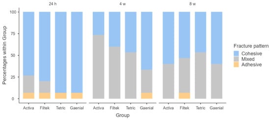 All these factors related to the materials’ composition could be related to the high cohesive and mixed fracture rates obtained at all time points; although at 8 weeks they decreased, they were still higher than in other studies [19,22].