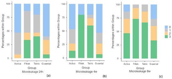 Microleakage frequency at each time point: (a) 24 h; (b) 4 weeks; (c) 8 weeks. Legend score 0: absence of dye penetration; 1: stain at the interface; 2: stain across the interface < 1 mm; 3: stain across the interface ≥ 1 mm.