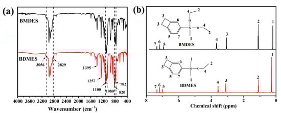 The FTIR spectra of BMDES and BDMES are shown in Figure 1a. In the FTIR spectrum of BMDES, the absorption peaks at 3056, 1590, 1462, 820, 782 cm−1 showed the composition of 1, 2, 4-substituted benzene. The absorption peaks at 2966 cm−1 and 2930 cm−1 were assigned to the telescopic vibration of C–H on alkoxy. The absorption peak at 2829 cm−1 was thought to be a four-membered ring at phenyl. The absorption peaks at 1395 and 1257 cm−1 showed the existence of Si–CH3. The absorption peaks at 1100 cm−1 and 1080 cm−1 were assigned to the C–O and Si–O telescopic vibration, respectively. In the FTIR spectrum of BDMES, the BCB structure and the bond of C–H and Si–O were also found at the same absorption location as in BMDES, because of the similar structure. BMDES and BDMES contained the same group species, so the same resonance absorption was observed in two curves at various wavenumbers in the IR spectroscopy.