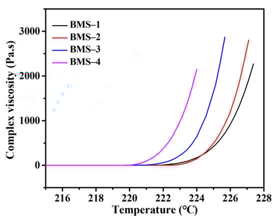 As shown in Table 2, the viscosity of BMS varied from 43.5 mPa s to over 2000 mPa s with changes in the raw material ratio. With the increasing BCB modified structural units in BMSs, the viscosity of BMSs changed more significantly, which showed that the viscosity of BMSs under normal conditions was obviously affected by the content of BCB. According to the complex viscosity curves obtained utilizing a rheometer (Figure 3), it can be seen that the complex viscosities of BMSs varied with the curing temperature. The cross-linking curing behavior of the silicone resins was investigated by characterizing the change in complex viscosity in the process of temperature change. The increase in complex viscosity was also correlated with the content of BCB, and significant large-scale intermolecular entanglement occurred 3 °C earlier in BMS-4 than in BMS-1. It indicated that the cross-linking conditions of silicone resins containing BCB were affected by the raw materials. Interestingly, an advanced increase in viscosity was obtained in BMS-1 with lower BCB content and, as the curing reaction went on, the viscosity increase in BMS-1 slowed down compared with those of others. It indicated that the initial low cross-linking unit density could block the free movement of the chains.