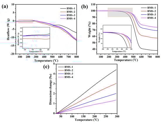 The thermal expansion properties of BMSs are shown in Figure 4c. The average thermal expansion coefficients of the cured BMSs were 164.8, 112.9, 75.97, and 51.57 ppm °C−1, respectively. Similar to the regularity of thermal stability, the TMA curves showed that the coefficients of the rate of the cured BMSs’ thermal expansion were slowly reduced from BMS-1 to BMS-4. The thermal expansion coefficient of materials remained constant during the testing process, and that of BMS-4 could reach the level of DVS-BCB (47 ± 3 ppm °C−1) [43,44]. This indicates that the thermal expansion properties of BMSs are closely related to the cross-linked density, the combination of BCB groups and Si–O–Si chains in BMS-1 made the cured BMS have a relatively high-density cross-linked network, and the effect of adding more BCB groups on the thermal expansion coefficient of BMSs gradually decreased.