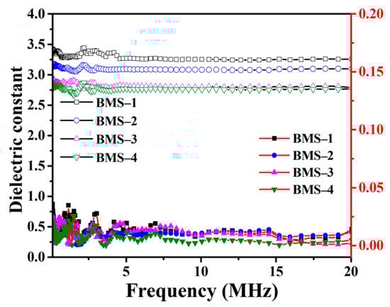 where C, d, and S represent the capacitance, thickness, and cross-sectional area (CSA) of the BMS sample, respectively. ξ0 represents the vacuum dielectric constant of 8.854 × 10−12 F m−1. Figure 5 shows the curves of the k and dielectric loss of BMSs with the frequency range from 100 KHz to 20 MHz. Below the frequency of 20 MHz, the k values of BMSs did not change significantly, and they were 3.30, 3.10, 2.84, and 2.77 at 10 MHz, respectively. The dielectric loss curves of BMSs show irregular changes but little fluctuation, and the tanσ values of BMSs were less than 1% at 10 MHz. The tanσ of BMS-4 is 3.59 × 10−3 and the dielectric loss is lower than that of DVS-BCB (tanσ = 8 × 10−3 at 1 MHz), which is widely used for low-k material.