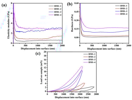 (a) The hardness curves of cured BMSs. (b) The BMSs’ variation curves of elastic modulus with indentation depth. (c) Loadingunloading curves against displacement into surface of cured BMSs.
