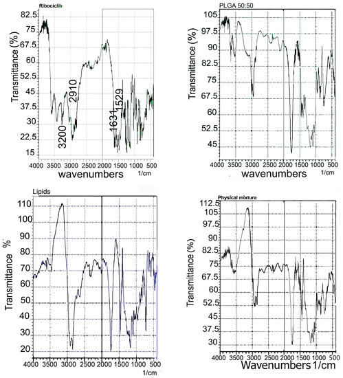 Ribociclib dissolved in the polymer–lipid matrix, diminishing its characteristic crystallinity but retaining its therapeutic activity, as seen by the shifting of the endothermic peak of both ribociclib and PLGA 50:50 and the changes in its intensity [52], as shown in Figure 5.