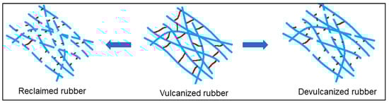 Different recycling methods for rubber are described in the literature [7,8], namely, mechanical [9,10,11,12], ultrasonic [13,14,15], chemical [16,17], microwave [18,19,20], cryogenic [21,22,23], microbial [24,25,26], thermo-mechanical–chemical [27,28,29], etc. Most of the recycling processes are mainly based on the random scission of the polymer network and crosslinks [4], whereas the selective breakdown of the crosslinks is required to improve the recycled rubber quality. The polymer chains have to stay intact as much as possible, which introduces the scope of devulcanization [3]. Devulcanized rubber depicts better mechanical properties than reclaimed rubber due to the higher percentage of intact polymer backbones [7]. Hence, devulcanization is considered the most sustainable solution for rubber recycling. A comparative schematic diagram of rubber reclamation and devulcanization is shown in Figure 1.