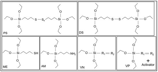 Chemical structure of the silanes used as DA (sample notations are explained in Table 2) (R1 and R2 = hydrocarbon chain).
