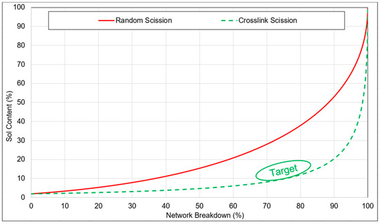 Sol content versus network breakdown percentage for main chain and crosslink scission according to the Horikx–Verbruggen plot.