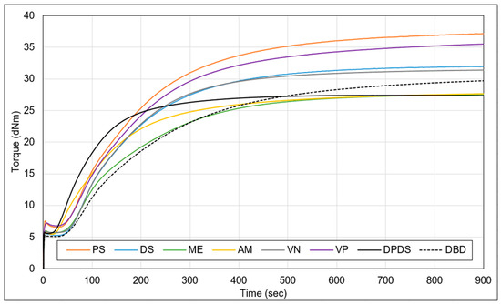 Based on Figure 6, the results reveal that the increase in curing torque is lowest for the DPDS samples, highest for the PS samples, and followed by the VP samples. This can be attributed to the presence of unreacted polysulphide moieties in the PS samples, which contributed to the formation of additional crosslinks and resulted in a greater curing torque increase. Furthermore, compared to the VN samples, the VP samples exhibited increased curing torque due to the contribution of the activator. Additionally, the samples with a lower degree of network breakdown exhibited a lower increase in torque, indicating less formation of additional crosslinks.