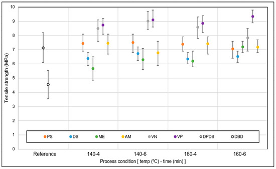 The comparative analysis of the tensile strength of the revulcanized samples is shown in Figure 7. The tensile strength of the revulcanizate varied with increasing time and temperature. The best stress–strain properties were obtained for the VN and VP samples. The tensile strength was in the range of 8 to 9.4 MPa. From these screening trials, it can be concluded that VP and VN as DAs resulted in the best mechanical strength.
