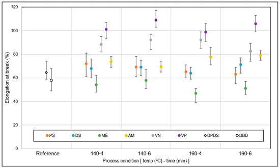 A comparative analysis of the elongation at break values of the revulcanized samples is shown in Figure 8. For the reference DAs as well as for PS, DS, and AM devulcanized samples, elongation at break was in the range of 60% to 80% and did not show any significant change with increasing time and temperature. For ME as DA, the range was between 50% to 65%, and for VN the range was 75% to 95%. The best elongation at break values were found for the VP samples, which were in the range of 95% to 110%.