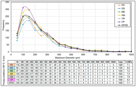 The homogeneity of the DA optimization trials was elaborated in the white rubber analysis. From the statistical analysis of the brownish devulcanizate dispersed in the white rubber matrix, the total number of visible particles and the particle size distribution were analyzed. The series of samples devulcanized at 160 °C for 6 min was selected. The comparative results for devulcanizates using different DAs are shown in Figure 9.