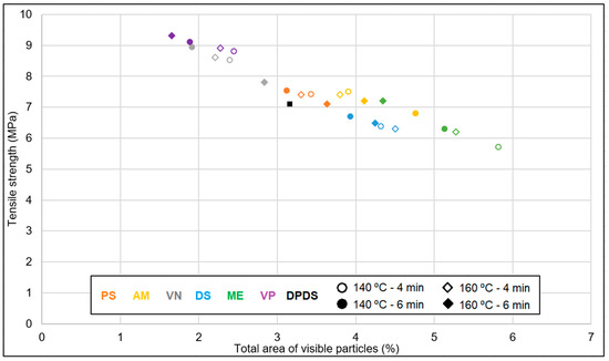 In Figure 10, the total area of visible particles (TAVPs) is plotted against the tensile strength (TS). With an increasing devulcanization efficiency, as indicated by a smaller TAVP, the TS improved. For ME devulcanized samples, the TAVP had the highest value, resulting in the lowest TS, and for VP as devulcanization aid, the TAVP was the minimum, resulting in the best TS, fitting with the explanation mentioned above.