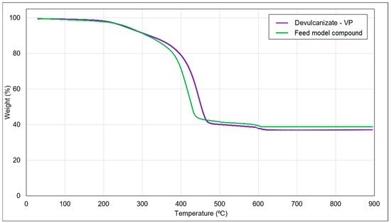 TGA analysis of the feed model compound and VP devulcanizate (sample notation is explained in Table 2).