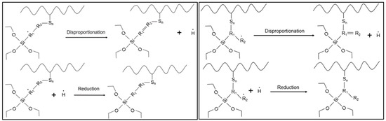 After the chain transfer, the molecule experiences a disproportion reaction to achieve greater chemical stability. The activator in the alkenyl silane improved the reactivity of the latter during devulcanization, as shown in Figure 13. An additional mechanistic investigation is necessary to prove this reaction hypothesis for the devulcanization.