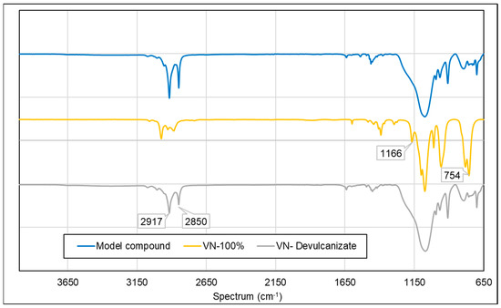 FTIR spectroscopy of the model compound, VN, and VN devulcanizate (sample notations are explained in Table 2).