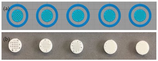 Simplify3D Professional Software images of the design from left to right from 60% to 100% of infill density (a) and images of the 3D-printed PLA9HA scaffolds obtained for one of the sets (b).