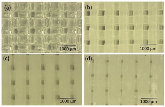 Magnified stereomicroscope images of PLA0HA scaffold with 100% infill (a), PLA3HA-100 (b), PLA9HA-100 (c) and PLA13HA-100 (d).