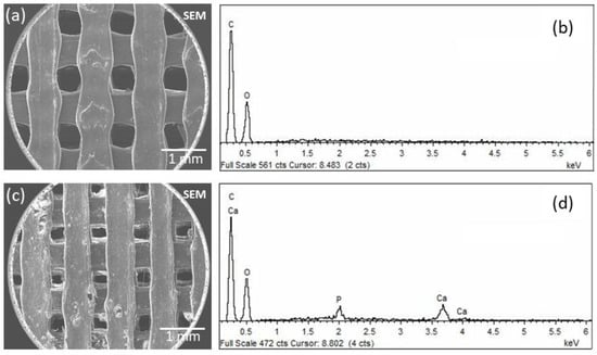 Going into detail with the morphology and elemental composition, a SEM/EDS analysis of the 3D-printed PLA/HA scaffolds was performed. In Figure 3, micrographs and spectra obtained for the PLA0HA-80% infill (Figure 3a,b) and PLA13HA-100% infill (Figure 3c,d) are shown. When observing the pore sizes, the highest infill density sample, PLA13HA-100% (Figure 3c), presented pores of about 250 µm from one wall to the front wall, which were 800–850 µm in the lowest-infill-density sample fabricated, PLA13HA-60% (Figure 2f). In the case of PLA free of HA, the scaffolds of PLA0HA-100% (Figure 2a) presented pores of about 350 µm, being around 500 µm in the case of PLA0HA-80% (Figure 3a). The wide range of pore sizes ≥250 µm obtained is in accordance with the ranges considered to be optimal for bone regeneration. Thus, the preference of osteoblasts for pores larger than 100 µm is generally stated [4,27,28,29]. Moreover, significant bone formation has been published for 800 µm scaffolds [30] and also 250 and 400 µm ones [31], while enhanced bone formation and vascularization are reported for scaffolds with pore sizes larger than 300 µm [4,32].
