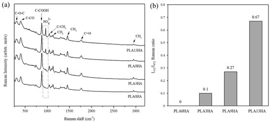 The evaluation of the main molecular vibrations by FT-Raman spectroscopy and their correspondence with certain functional groups that constitute the 3D-printed scaffolds was first assessed. Figure 4a shows the Raman spectra for PLA alone and the PLA/HA scaffolds fabricated with 100% of infill. The characteristic spectrum of 3D-printed PLA [34] was clearly observed when the PLA0HA-100% scaffold was analyzed, with the corresponding bands present at 298 cm−1 and 397 cm−1, respectively assigned to bending C-O-C and C-CO groups, an intense and sharp band at 872 cm−1 attributed to C-COO stretching, at 1041 cm−1 to C-CH3 skeletal stretching, at 1124 cm−1 to CH3 asymmetric rocking, at 1455 cm−1 to CH3 symmetric bending, at 1770 cm−1 to C=O asymmetric stretching and, finally, at 2946 cm−1 to CH3 symmetric stretching. When the Raman spectra obtained for PLA3HA, PLA9HA and PLA13HA scaffolds were observed (Figure 4a), it was noted that they presented the same PLA characteristic bands, together with, as expected, the band at 962 cm−1 attributed to the PO4−3 symmetric stretching mode of calcium phosphates [35], which corresponds to hydroxyapatite [36]. Figure 4b presents the quantitative evaluation of the HA incorporated into the 3D-printed PLA/HA scaffolds calculated from the FT-Raman spectra (Figure 4a) by using the ratio of the HA-related band intensity and the one of the intense and sharp PLA-related band at 872 cm−1 (I962/I872). Thus, as it can be observed, the I962/ I872 ratio of the scaffolds shown in Figure 4b increases, as expected, with the wt.% of HA incorporated into them. These quantitative results easily obtained from the FT-Raman spectra can be of interest in the development of quality control techniques for 3D-printed PLA/HA scaffolds.