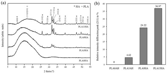 XRD diffraction patterns of PLA0HA and PLA/HA scaffolds in position 5–55° with crystal planes respectively attributed to PLA and HA are indicated (a). Quantitative evaluation of the diffraction peak intensity (211) in percentage as a function of wt.% HA incorporated into the scaffolds (b).