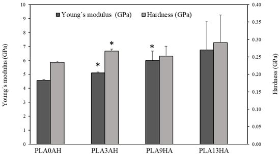 Young’s modulus and hardness of PLA discs with different concentrations of HA with 100% infill. The bar plot represents means ± standard errors. Statistical significance * (p ≤ 0.05) was determined with respect to the control, the scaffold without HA (PLA0HA).
