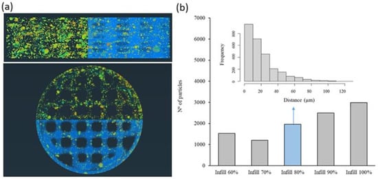 To evaluate in depth the distribution of the HA particles in the 3D-printed scaffold fabricate by the proposed one-step methodology, a detailed study was performed using computed tomography. In this aspect, it is important to notice that the distribution of HA in the PLA matrix will influence not only the mechanical properties but also the regeneration process given the influence of surface roughness and HA direct availability on bone cell adhesion and activity. Thus, the size of HA particles after the printing process and their distance from the surface of the PLA matrix were evaluated. In Figure 7a, the distribution of HA particles (mainly orange, yellow and green colors) embedded in the PLA matrix (blue color) can be observed in a segmented image of the PLA13HA scaffold with 60% of infill. The different color of the HA particles indicates different distances in depth from the PLA surface to the inner part of each PLA/HA printing filament. The warmer colors (orange) correspond to the HA particles situated closer to the PLA surface. A homogeneous distribution of HA particles, both the longitudinal and cross sections of the scaffolds at the macro level, can be first easily observed together in Figure 7a with the size of the HA particles being in the range from 0 to 1 × 10−4 mm3. Larger sizes correspond to particle aggregates caused by the stop/start-up operation linked to this manufacturing methodology and can be clearly observed in the PLA13HA scaffolds (Figure 3c). The quantitative data of the HA particle distribution were obtained for the different 3D-printed PLA/HA scaffolds, registering the number of HA particles in relation to their position in distance from the surface. For it, and given that different parts of a single HA particle will be at different distances in depth from the cord surface, the average distance of each particle was the one calculated. These quantitative data are presented in Figure 7b for the PLA3HA scaffolds with infill from 60 to 100%. It can be first observed that the number of particles in each scaffold tends to increase with the percentage of infill, as expected, obtaining a maximum number of around 3000 particles in the case of PLA3HA-100%, with around 1000 particles for the same scaffold with the lowest infill. The frequency distribution of those particles was also obtained for all the scaffolds and presented in the inset of Figure 7b for the PLA3HA-80% scaffolds. At the micro level, related to the biocomposite cords, an exponential distribution of particles can be seen from the surface toward the interior of the cord, found in the first 80 μm (10% of the entire cord). This exponential distribution was repeated for the remaining samples in the series. This distribution would be beneficial for the application described by providing highly bioavailable HA and favoring the interaction with the cells without the need to wait for the entire degradation of the polymer.