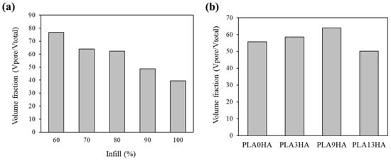 Volume fraction for PLA9HA scaffolds fabricated with different % of infill (a) and scaffolds with 70% of infill fabricated with different HA incorporations from 0 to 13 wt.% (b).