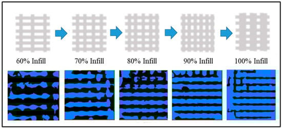Table 4 shows the N2(X) values found for all the 3D-printed PLA/HA scaffolds, where more negative values indicate a lesser number of connected paths. Thus, it can be observed that as the connectivity factor decreases, with higher negative values, the percentage of infill increases up to 90%. This decrease in connectivity is expected, as a higher number of printing cords reduces the number of interconnected pores (see the diagram in Figure 9). That is in good agreement with the CT porosity in the total volume (Figure 8, Table S1), which decreases with increasing infill percentage. However, for 100% of infill, the connectivity values were equal to the ones at the lower infills, hence a high connectivity. This can be explained by the high density of the printing cords, which makes the software consider some paths of the pore network as closed, as it does not identify several printing cords and takes them as one (less infill). In addition, again, the PLA13HA scaffolds presented a more irregular behavior, in this case, of connectivity with the infill percentage. Moreover, these scaffolds (PLA13HA) presented the highest connectivity values for infill percentages of up to 90% in comparison to the scaffolds with a lower contribution of HA (PLA0HA, PLA3HA, PLA9HA) for the same corresponding infill. The aggregates and the high number of HA particles in these PLA13HA scaffolds promote it to present a high connectivity at a lower CT porosity in the total volume of the scaffold (according to the CT-porosity values).