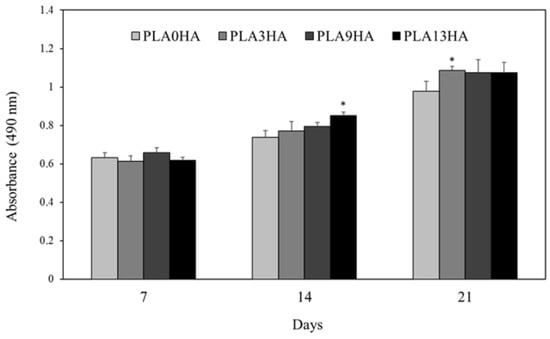 Cell proliferation (MTS assay) of the human osteosarcoma MG63 cell line after incubation for up to 7, 14 and 21 days on scaffolds of PLA0HA, PLA3HA, PLA9HA and PLA13HA. The bar chart represents mean ± standard error. Statistical significance was determined at * (p ≤ 0.05) with respect to the control, the scaffold without HA (PLA0HA).