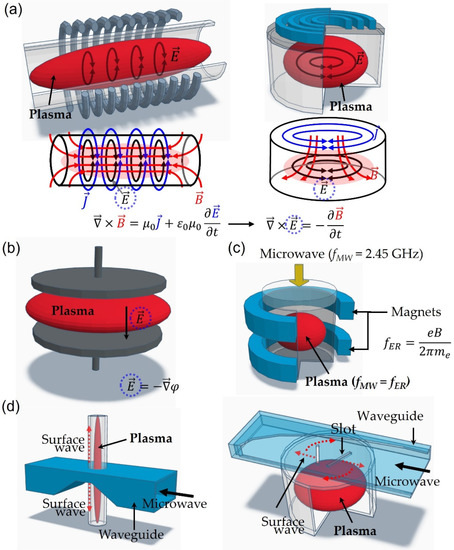 Schematic diagrams for plasma generation with different configurations: (a) inductively coupled plasma (ICP): Maxwell equations related to the generation of ICP and the schematic diagram for the applied current (: current density, solid blue line), induced magnetic field (, solid red line), and electric field (solid black line) in different ICP configurations; (b) capacitively coupled plasma (: electric field; φ: electric potential); (c) microwave plasma: electron resonant plasma (fMW: microwave frequency; fER: electron resonance frequency); (d) microwave plasma: surface-wave sustained plasma.