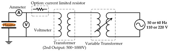A CF (50/60 Hz) power simply consists of a transformer and a voltage controller. Usually, the variable transformer, called VARIAC or power-stat, is used as the voltage controller, and the output voltage is boosted using a transformer with an appropriate step-up ratio. A secondary output voltage of the transformer is about 500–1000 V for low-pressure conditions, and several kV for high-pressure conditions, including atmospheric discharge. The voltmeter and ammeter are needed for the voltage and current measurements during plasma discharge. The CF power source does not necessitate a complicated power conversion system, such as a matching network and frequency generation components. As a result, the power structure is straightforward, cost-effective, and easy to use in a laboratory. At high-pressure and high-voltage discharge conditions, such as atmospheric conditions, the plasma tends to shift from glow discharge to arc spark due to a slow change in voltage polarity [25,26,51,52,53]. Thus, the power is often applied to the electrode through a suitable resistor to limit the discharge current. Moreover, it is recommended to use a suitable fuse to block the overcurrent for safety. Figure 2 shows the schematic diagram of a CF (50/60 Hz) power source.