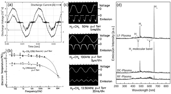 Properties of plasma discharge generated using a commercial frequency (CF, 50/60 Hz) power source and comparison of results for DC- and RF-derived plasma: (a) time-resolved applied voltage and discharge current for Ar plasma discharge [29], (b) change in the electron temperature in H2 and H2-CH4 plasma as a function of plasma power frequency (○: H2 + CH4, ×: H2) [28], (c) oscillograms of optical emission intensities and applied voltage at different power frequencies [28], and (d) optical emission spectra of H2 plasma generated using DC, CF, and RF power sources [29]. ((a,d) reprinted with the permission from Ref. [29]. (2003, KPS). (b,c) reprinted from Ref. [28]. (1991, AIP Publishing).).
