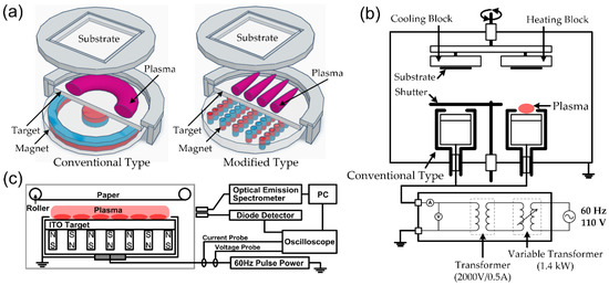 Magnetron sputtering system for transparent conductive thin film deposition using a commercial-frequency (CF) power source: (a) comparison between conventional sputtering gun (left) and modified sputtering gun with parallel magnet array (right), (b) ITO and IZO film depositions on glass and polymer substrates using CF (60 Hz) sputtering [63,64], and (c) ITO film depositions on paper substrates using CF (60 Hz) DC-pulsed sputtering [65]. ((c) reprinted with permission from Ref. [65]. 2021, Elsevier).