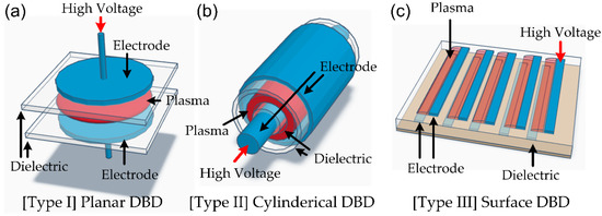 Schematic diagram of typical dielectric barrier discharge (DBD) configurations: (a) planar-type DBD source, (b) cylindrical type DBD source, and (c) surface-discharge type DBD sources.