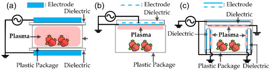 In-package plasma is a type of plasma technology that involves using a plasma source integrated into a packaging material or product [82,83,84,85,86,87,88]. This allows for the inactivation of microorganisms and other pathogens on the product’s surface without additional processing steps. The plasma source used in in-package plasma systems is typically a non-thermal plasma, which means that it operates at relatively low temperatures compared to thermal plasmas. Non-thermal plasma sources can generate a variety of reactive species, such as ozone, hydrogen peroxide, and other radicals, which can effectively inactivate microorganisms on surfaces. The generation method for in-package plasma is usually a dielectric barrier discharge (DBD). The DBD is a form of CCP, and the plasma is generated between two electrodes separated by an insulating (or dielectric) barrier, as shown in Figure 6. The dielectric barrier can stop excessive currents and prevent arc (or spark) formation. The DBD has been widely applied in various fields: ozone generation, ultraviolet (UV) and excimer light sources, polymer surface modification, bio/medical applications, air pollutant cleaning, etc. [3,41,67,68,69,89,90,91,92,93,94,95,96]. Usually, mid-frequency power (typically 10–30 kHz) is used to generate DBD, and DC discharge cannot be applied due to the existence of the dielectric barrier [3,41,67,93]. CF power is also applied to generate DBD plasma, which does not require an impedance-matching network. This simplicity and affordability make DBD systems more practical for industrial applications. DBD devices can be constructed in various configurations, and planar, cylindrical, and surface-discharge type configurations (Figure 6) are widely used.