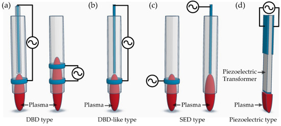 Schematic diagram of typical configurations for the generation of cold atmospheric pressure plasma jet: (a) dielectric barrier discharge (DBD) jets, (b) DBD-like discharge jet, (c) single electrode discharge (SED) jets, and (d) piezoelectric direct plasma jet.
