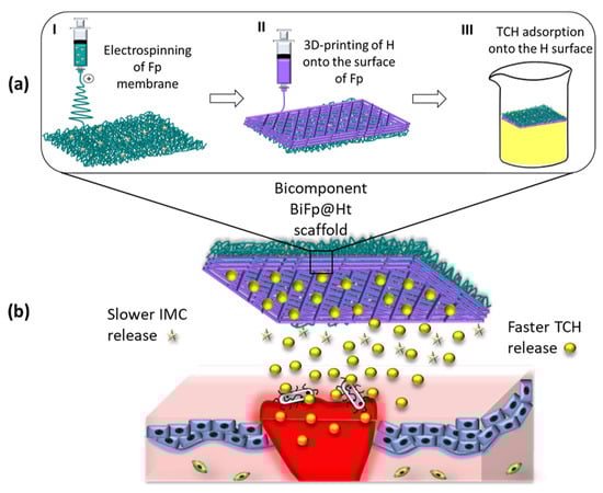 (a) Scheme for obtaining the bicomponent scaffold (BiFp@Ht) by the electrospinning and 3D-printing technologies and (b) its in vitro application.
