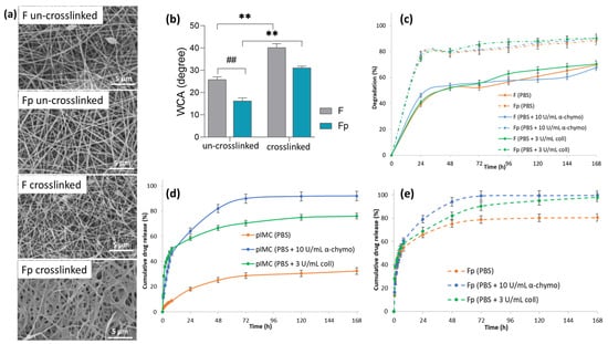 (a) SEM micrographs of un-crosslinked and crosslinked nanofibrous membranes, at 7000× magnification; (b) water contact angle of the F and Fp un-crosslinked and crosslinked electrospun membranes (## p < 0.01; ** p < 0.01); (c) in vitro degradation of F and Fp in PBS at 37 °C, in the presence of α-chymotrypsin or collagenase for 168 h; in vitro release profile of IMC from (d) pIMC, and (e) Fp in PBS at 37 °C, in the presence of α-chymotrypsin or collagenase within 168 h.
