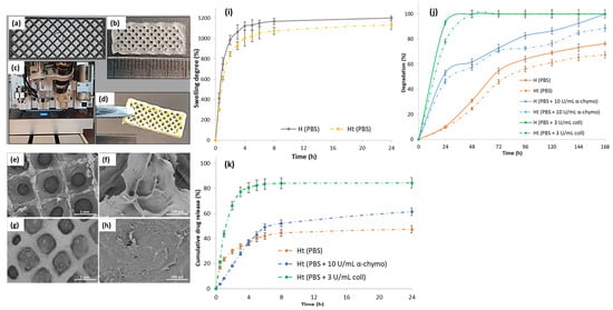 (a) Software 3D-printed pattern; (b) digital photograph of the 3D-printed hydrogel with dimensions of 20 mm × 8 mm, in 5 layers; (c) photo-crosslinking step of the 3D-printed hydrogel using a UV lamp at 365 nm; (d) digital photograph of the lyophilized TCH-loaded scaffold; SEM micrographs of the lyophilized (e,f) H and (g,h) Ht scaffolds; (i) in vitro swelling behavior of the H and Ht 3D-printed scaffolds analyzed in PBS at 37 °C; (j) in vitro degradation of H and Ht in PBS, at 37 °C, in the presence of α-chymotrypsin or collagenase for 168 h; (k) in vitro TCH release profile from the Ht hydrogel in PBS, at 37 °C, in the presence of α-chymotrypsin or collagenase for 24 h.